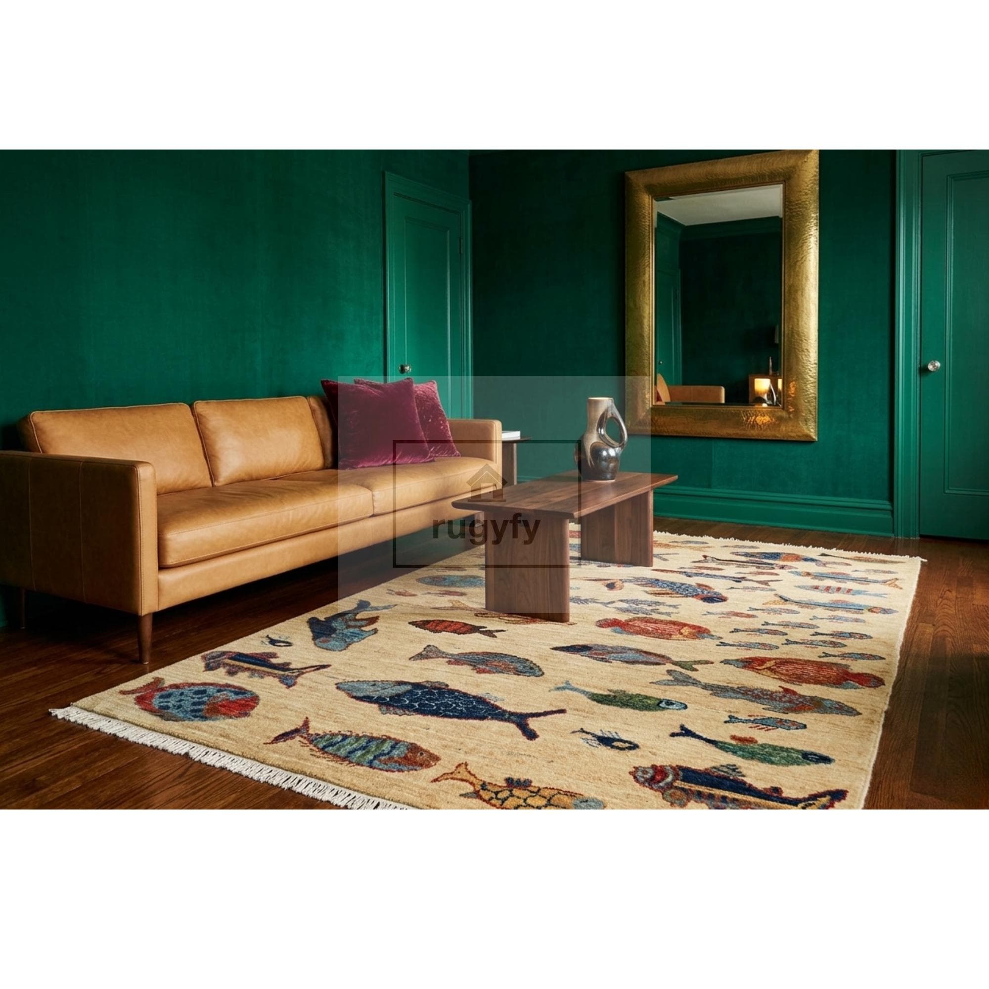 A rare hand-knotted pictorial Oushak treasure — a living aquarium woven into wool. Dozens of playful fish swim across a warm ivory field, each one individually knotted by master artisans in the Bhadohi–Mirzapur weaving belt of India, in the Turkish Anatolian pictorial tradition.