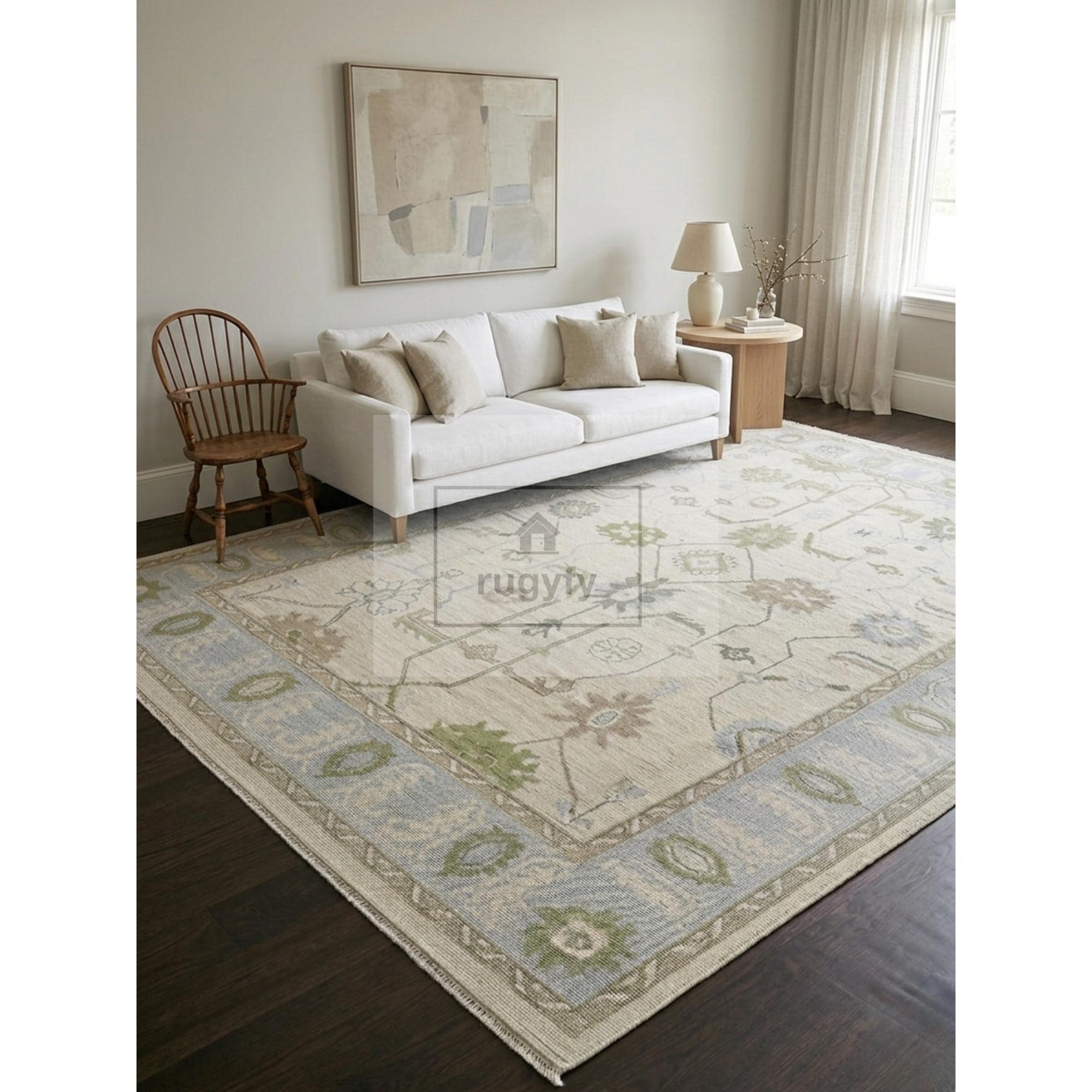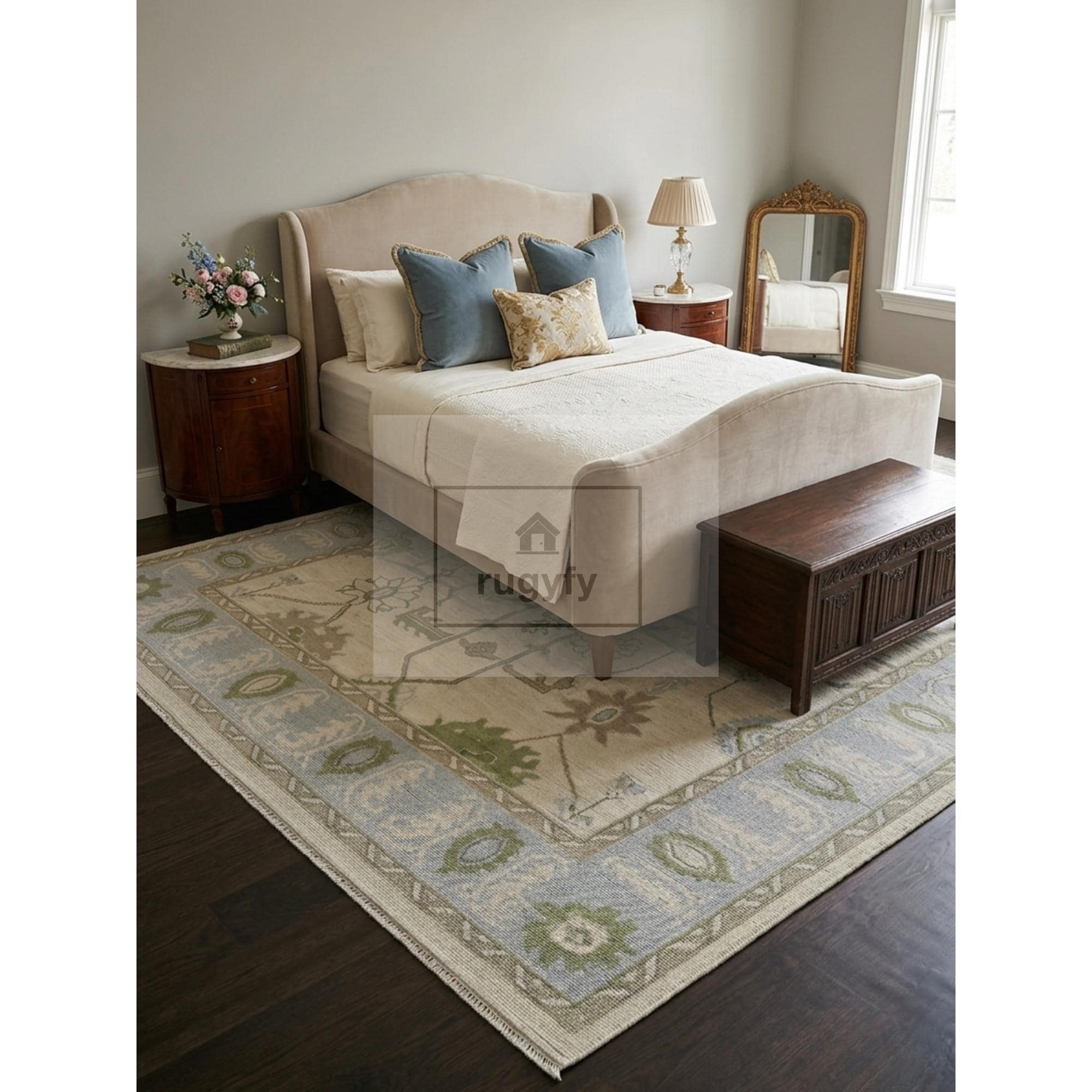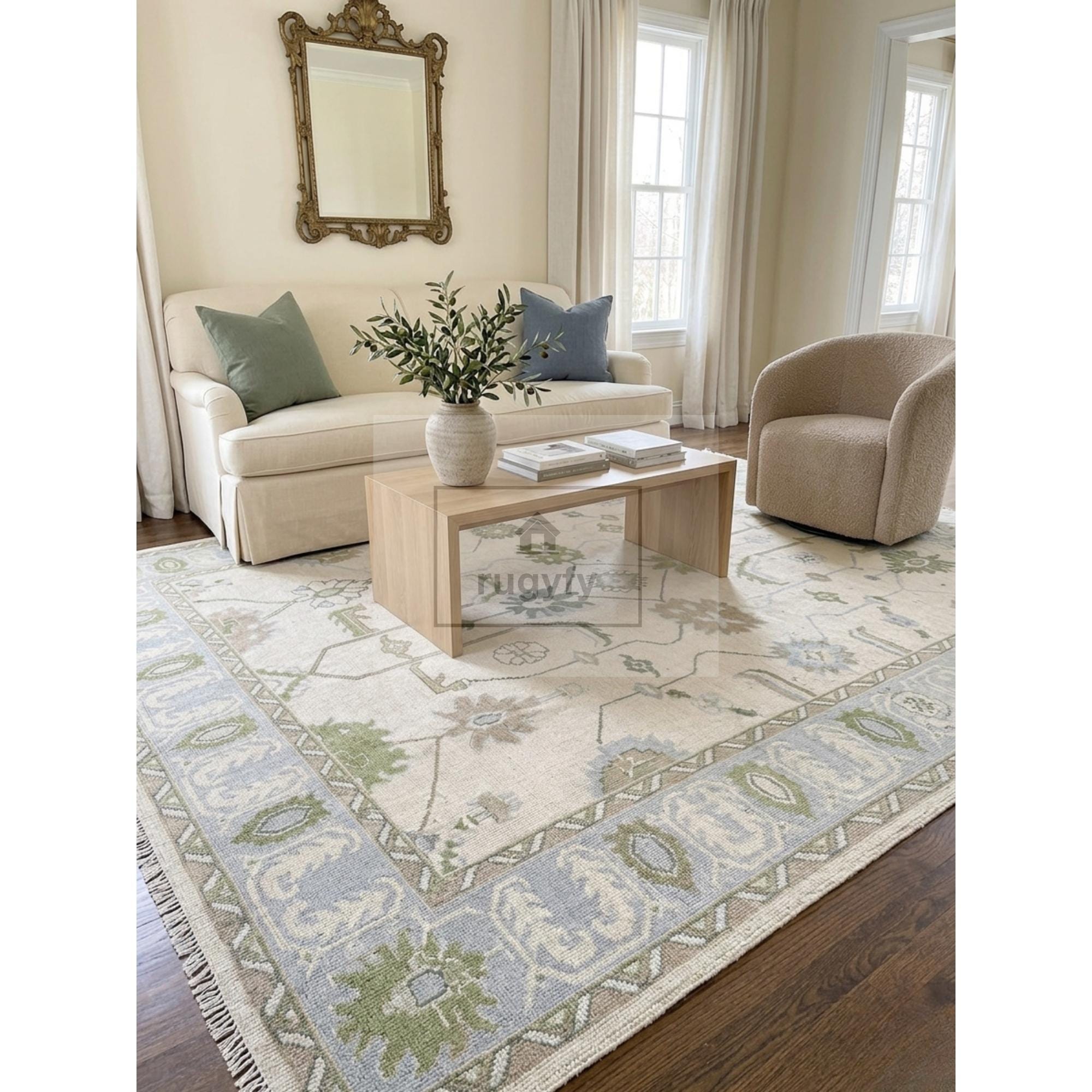 A breath of light and quiet elegance for the modern designer interior. This hand-knotted Oushak area rug pairs a luminous ivory ground with cool sky-blue borders, soft sage-green florals, and warm camel accents — a palette that aligns with Etsy's 2026 Patina Blue Color of the Year and Pinterest's Cool Blue trend forecast. Crafted in the Turkish Oushak weaving tradition by master artisans in the Bhadohi-Mirzapur belt of India, every motif is rendered knot by knot from premium 100% New Zealand wool.
