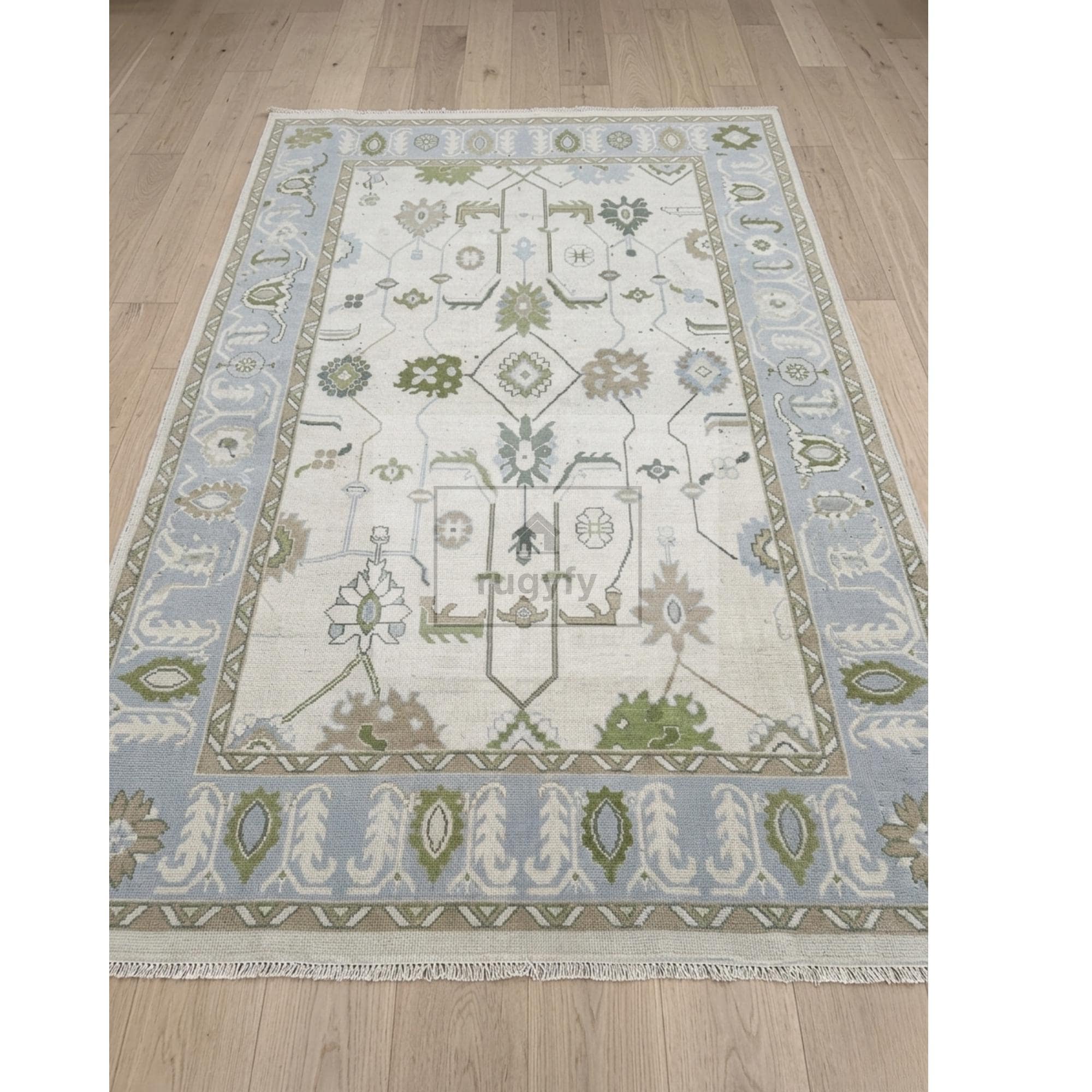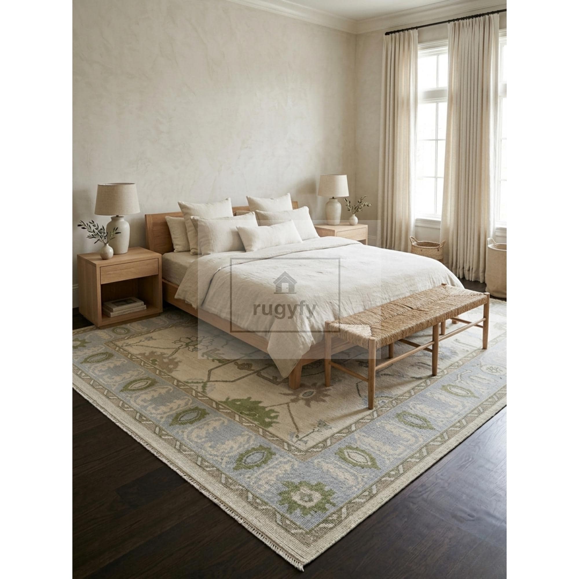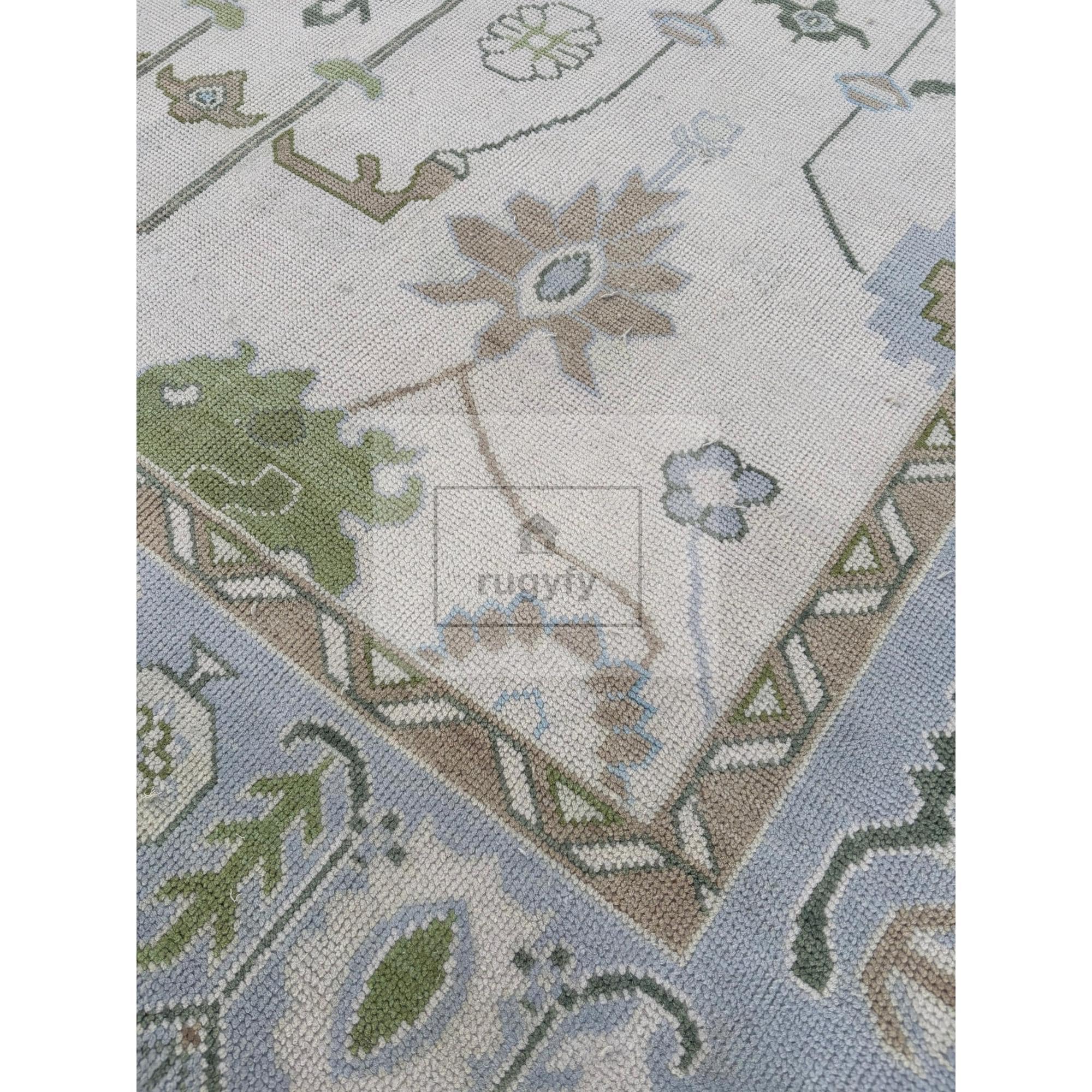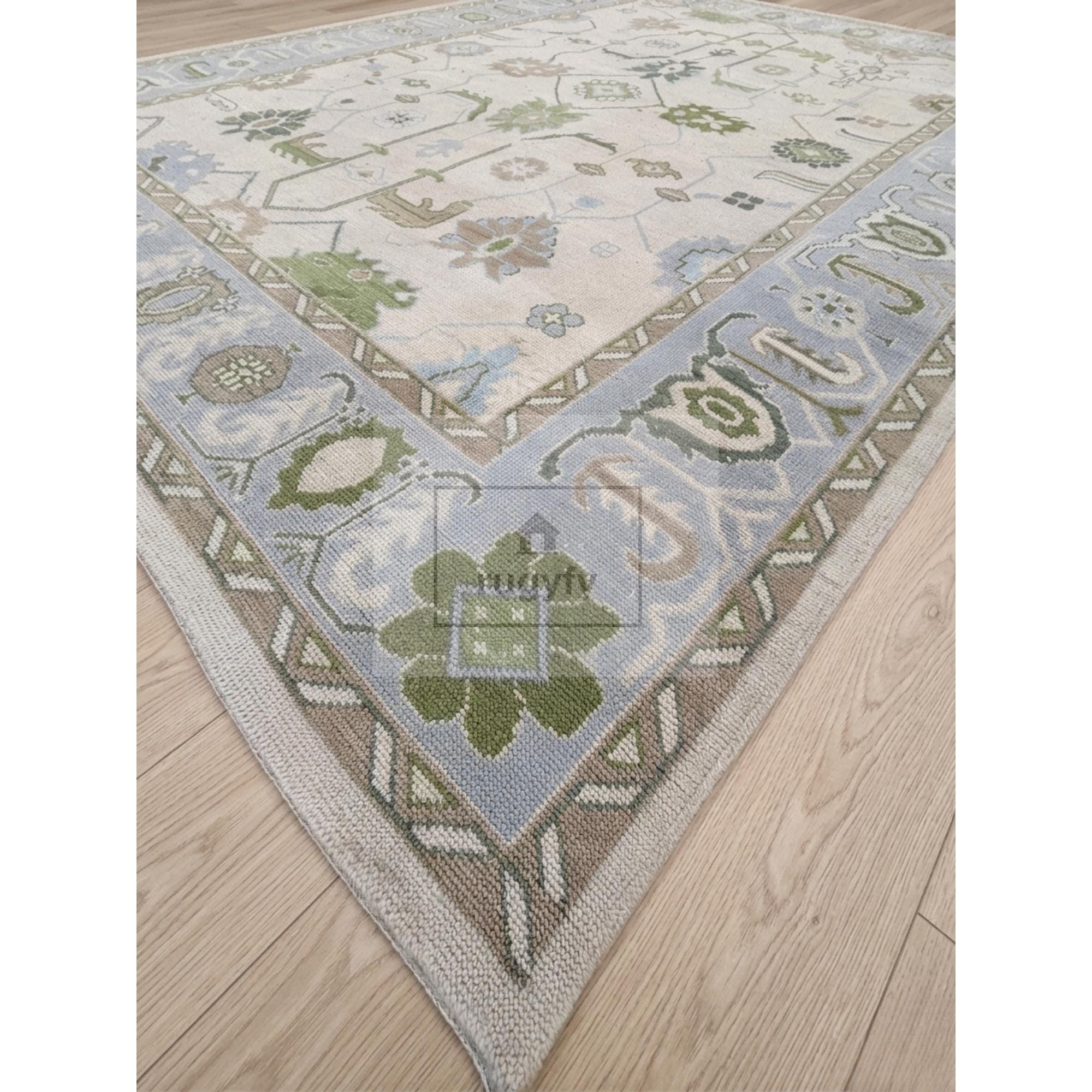 A breath of light and quiet elegance for the modern designer interior. This hand-knotted Oushak area rug pairs a luminous ivory ground with cool sky-blue borders, soft sage-green florals, and warm camel accents — a palette that aligns with Etsy's 2026 Patina Blue Color of the Year and Pinterest's Cool Blue trend forecast. Crafted in the Turkish Oushak weaving tradition by master artisans in the Bhadohi-Mirzapur belt of India, every motif is rendered knot by knot from premium 100% New Zealand wool.